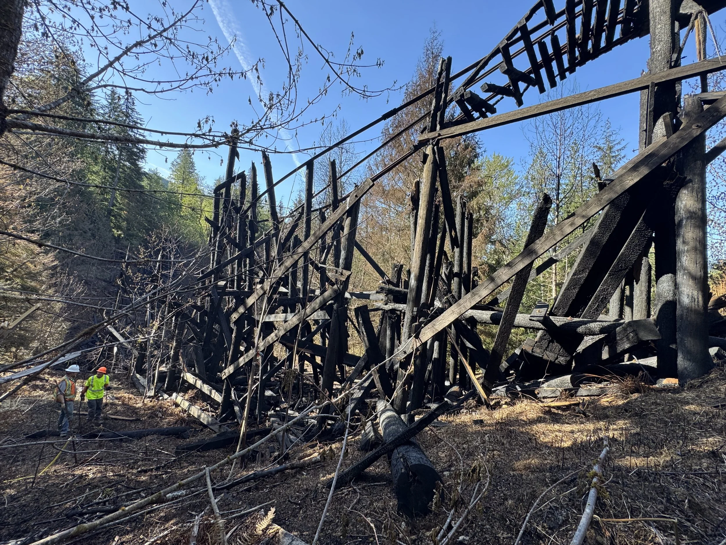 On the morning of April 30, 2025, just hours after Mt. Rainier Scenic Railroad received executed paperwork finalizing our purchase of the railroad from Tacoma Rail, a devastating fire destroyed the largest historic structure on the line: a 26-span, 400-foot-long wooden trestle located just west of the town of Morton. This trestle wasn’t just a piece of infrastructure—it was the critical link in a long-planned effort to expand rail service, revive freight operations, and reconnect rural communities through sustainable tourism and economic development.